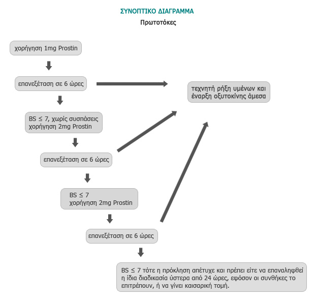 Εάν το bishop’s score είναι ≤ 7, τότε χορηγούμε 1mg prostin. Η μέγιστη δοσολογία είναι δύο δόσεις του 1mg prostin με μεσοδιάστημα 6 ωρών.